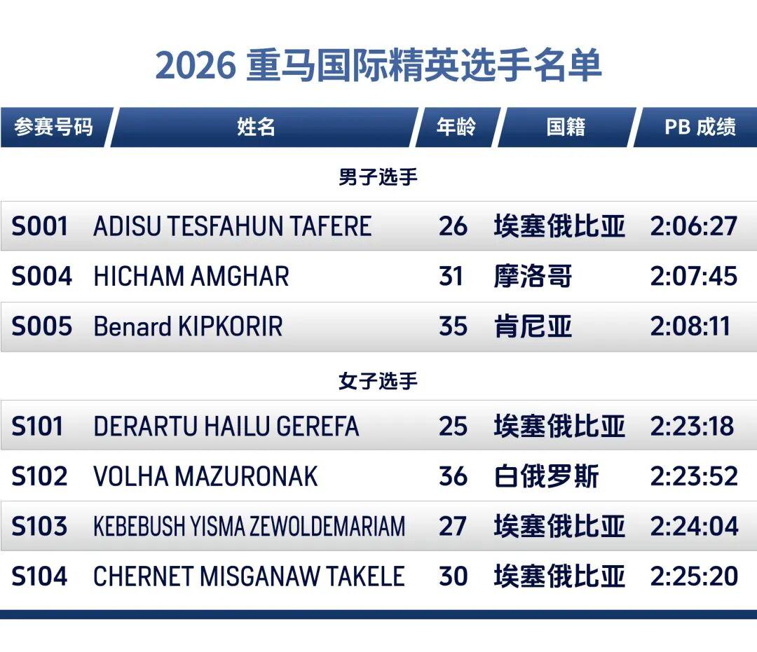 重奖之下,必有勇者。此次重马的参赛阵容颇有来头。国际男选手方面,26岁的阿迪苏·特斯法洪·塔费雷最好成绩是去年在塞维利亚马拉松跑出的2:06:27,他也将成为本届重马破赛会纪录最有力的人选之一;另外两位国际男选手也都在207和208的水平,都有机会夺冠并破赛会纪录。而四位国际女选手的最好成绩都要好于重马国内卫冕冠军丁常琴。